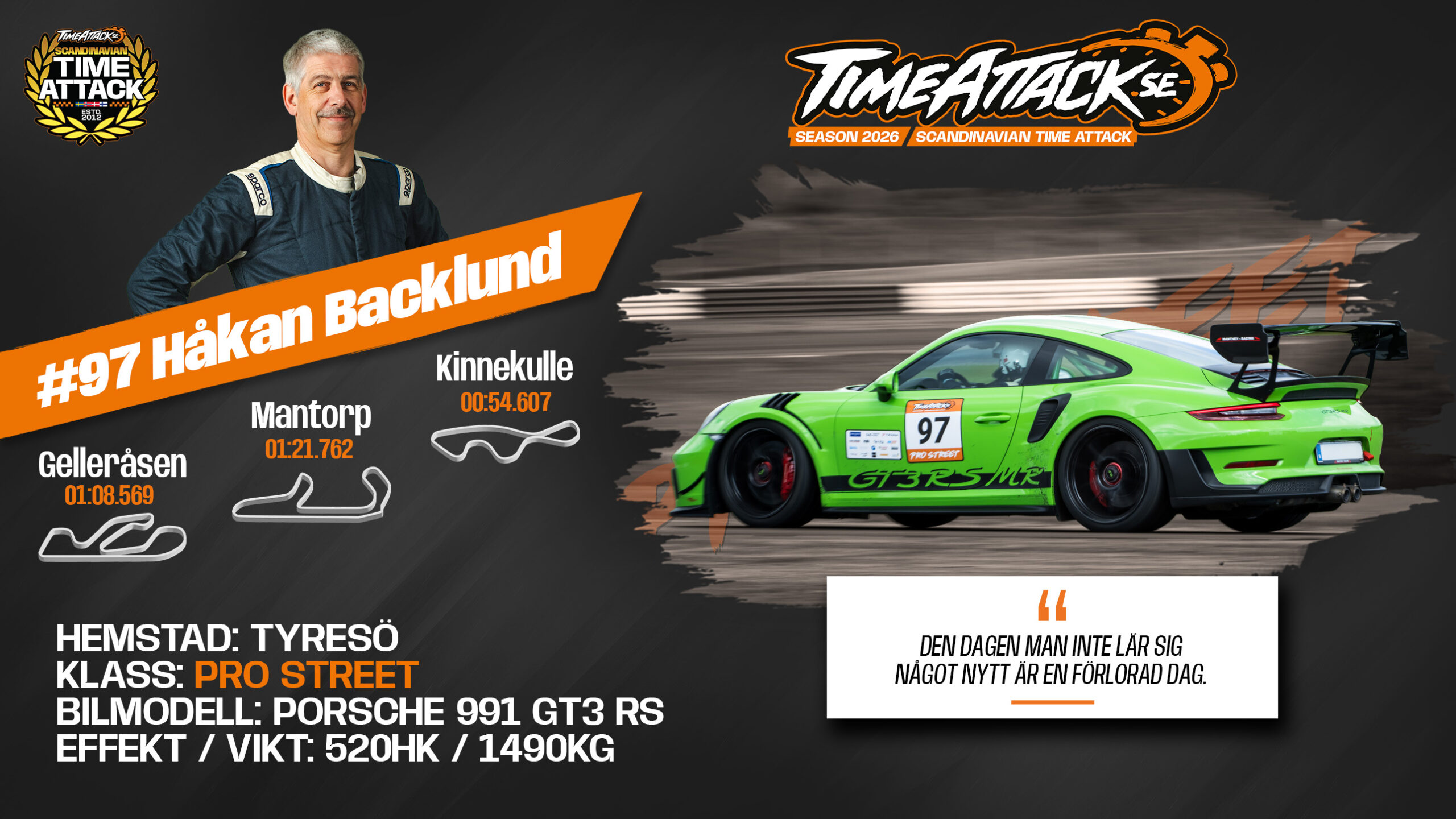 Efter ett nästan slumpartat gästspel med sin Porsche 997 GT3RS under historiens första ”King of Mantorp” 2014, så har Håkan etablerat sig som en av de snabbaste trackday Porsche-förarna i Sverige. Serievinsten i Pro Street 2021 med en 991.2 GT3RS var många silver/bronsmedaljer senare.