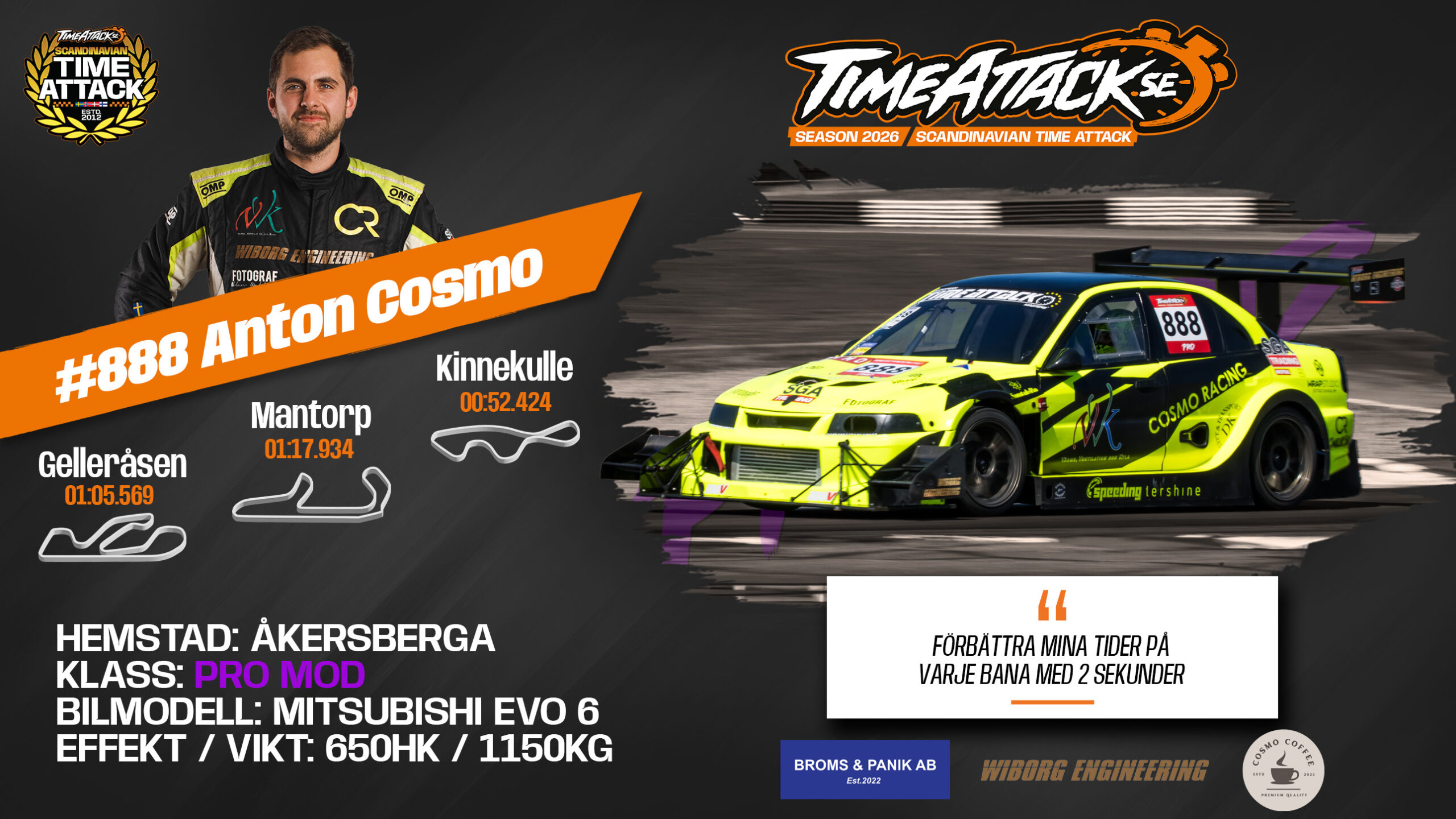 Lugn och samlad bakom ratten – men när det väl gäller, infinner sig ett starkt och fokuserat driv. För Anton handlar årets säsong om att njuta av varje stund, ha kul och undvika stressen. En balanserad inställning som ofta ger resultat.