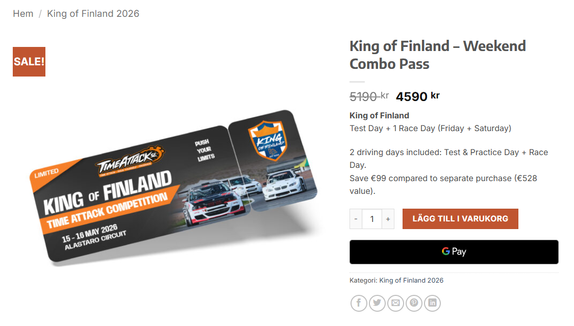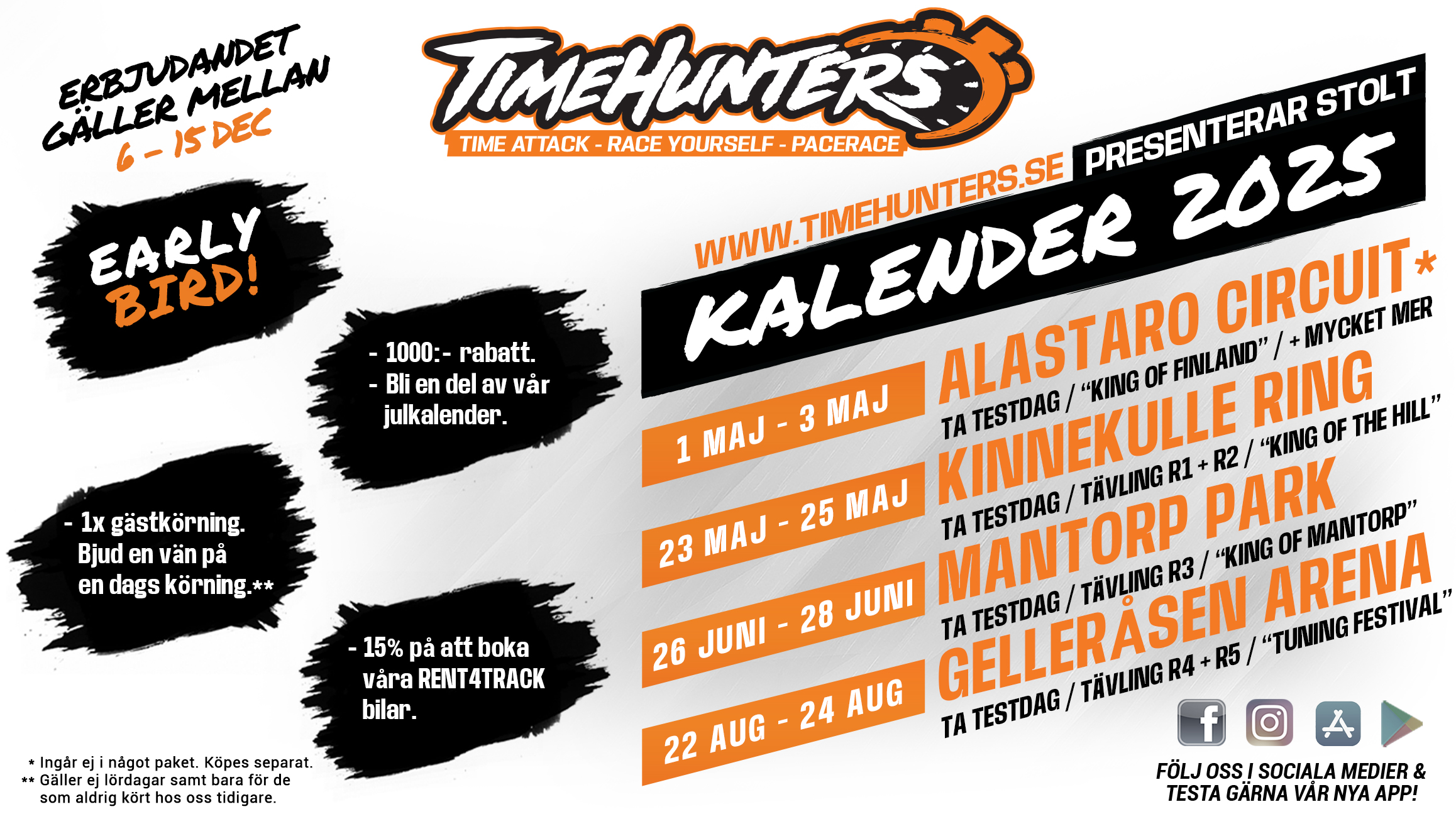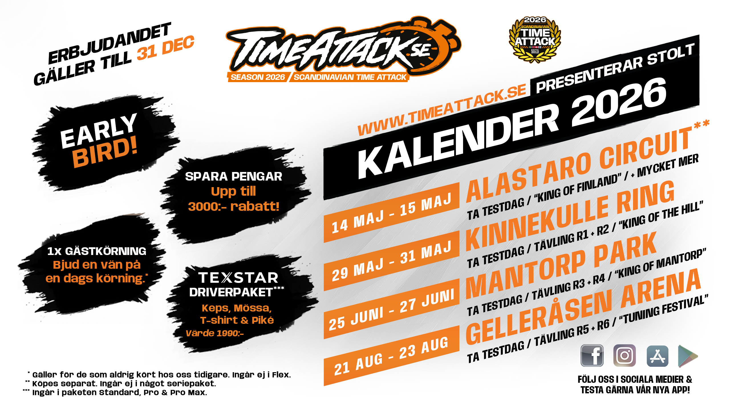 Under varje tävlingshelg arrangeras en för tilläggskostnad (2990:-, billigare för förare som bokat ”Plus-paket”) Time Attack testdag, med gruppindelade pass...